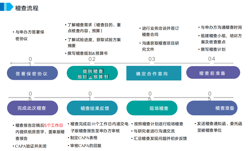 稽查报告撰写;稽查问题汇总与分析;稽查问题整改验证;CAPA制定;CAPA跟踪审查;稽查结果汇报;稽查结束资料整理