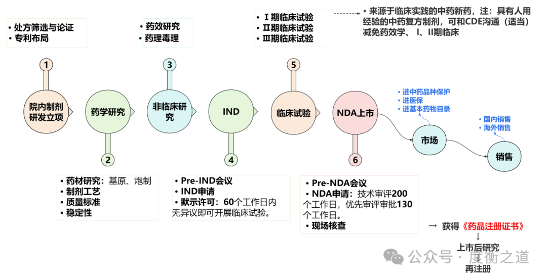 注:1.人用经验和Ⅱ期临床原则上只需开展1个;2.药学研究及非临床研究可以和人用经验同期开展